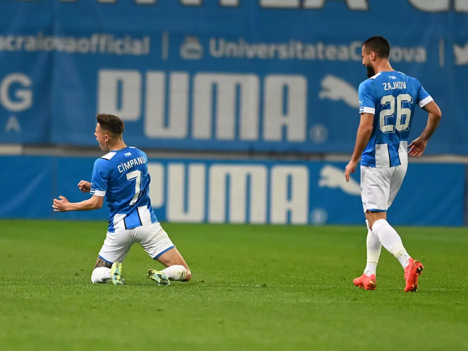 Alexandru George Cimpanu se bucura dupa un gol marcat alaturi de Gjoko Zajkov in meciul de fotbal dintre Universitatea Craiova si Rapid Bucuresti, contand pentru Play-off-ul Superligii Superbet, desfasurat pe Stadionul Ion Oblemenco din Craiova, duminica 16 aprilie 2023. © FOTO:Razvan Pasarica/SPORT PICTURES