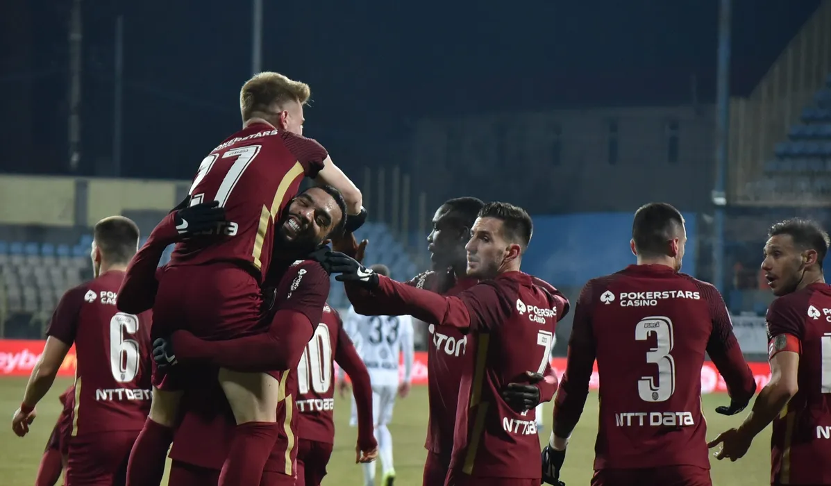 Claudiu Adrian Mihai Petrila se bucura dupa un gol marcat alaturi de colegii sai in meciul de fotbal dintre Gaz Metan Medias si CFR Cluj, contand pentru Liga 1 Casa Pariurilor, desfasurat pe Stadionul Municipal din Medias, sambata 12 februarie 2022. © FOTO:Alexandru Veres/SPORT PICTURES