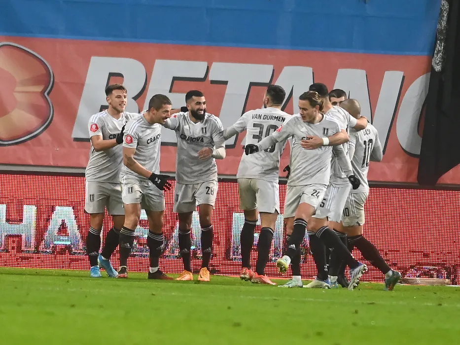 Bucurie a fotbalistilor craioveni dupa un gol marcat cu Constantin Dragos Albu, Alexandru Vlad Achim, Yassine Bahassa si William Guido R Baeten in meciul de fotbal dintre Universitatea Craiova si FC U Craiova, contand pentru Superliga Superbet, desfasurat pe Stadionul Ion Oblemenco din Craiova, sambata 3 decembrie 2022. © FOTO:Razvan Pasarica/SPORT PICTURES