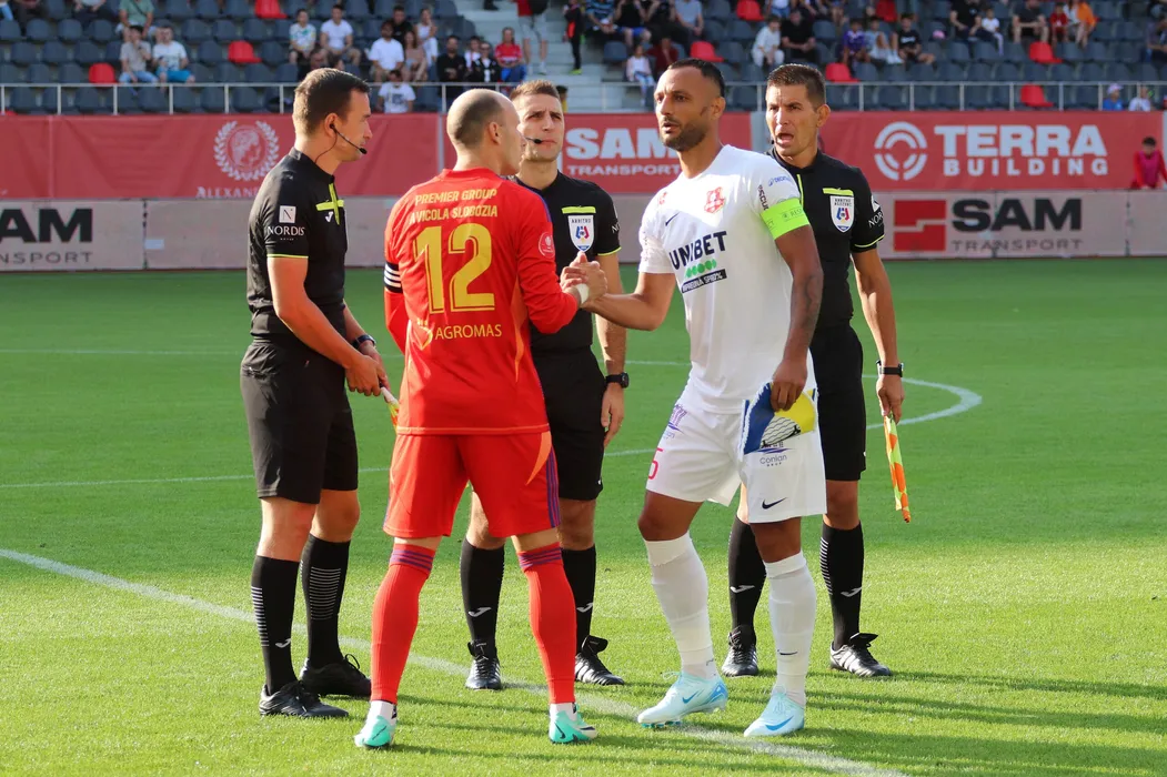 Brigada de arbitrii formată din Rareș George Vidican, Ciprian Florin Danșa și Raul Ghiciulescu alături de căpitanii Florin Bejan și Denis Rusu la startul meciului de fotbal dintre AFC Hermannstadt Sibiu si AFC Unirea 04 Slobozia, contând pentru Superliga Superbet, desfășurat pe Stadionul Municipal din Sibiu, vineri 26 iulie 2024. © FOTO: Valentin MACREA/SPORT PICTURES