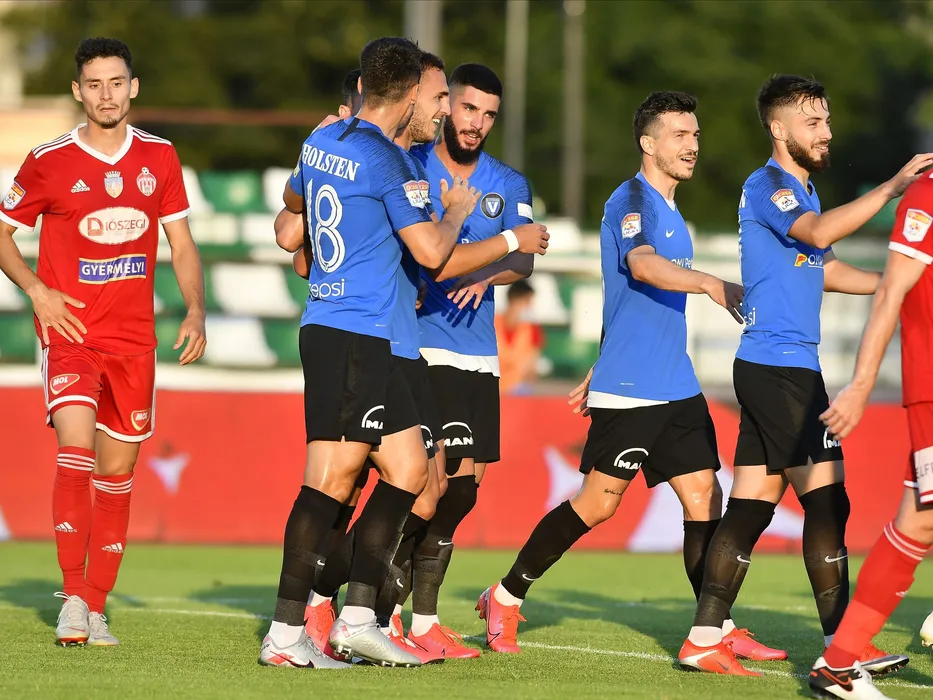 Bucurie a fotbalistilor Viitorului cu Virgil Eugen Ghita, Radu Stefanita Boboc si Cosmin Gabriel Matei spre dezamagirea lui Nicolae Carnat in meciul de fotbal dintre Sepsi OSK si FC Viitorul, contand pentru play-out-ul Ligii 1 Casa Pariurilor, disputat fara spectatori pe stadionul Municipal din Sfantu Gheorghe, sambata 27 iunie 2020.