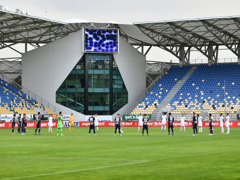 Fotbalistii celor doua echipe tin un minut de reculegere inaintea meciului de fotbal dintre Chindia Targoviste si FC Viitorul, contand pentru Liga 1 Casa Pariurilor, disputat fara spectatori pe Stadionul Ilie Oana din Ploiesti, miercuri 17 iunie 2020. © FOTO:Razvan Pasarica/SPORT PICTURES