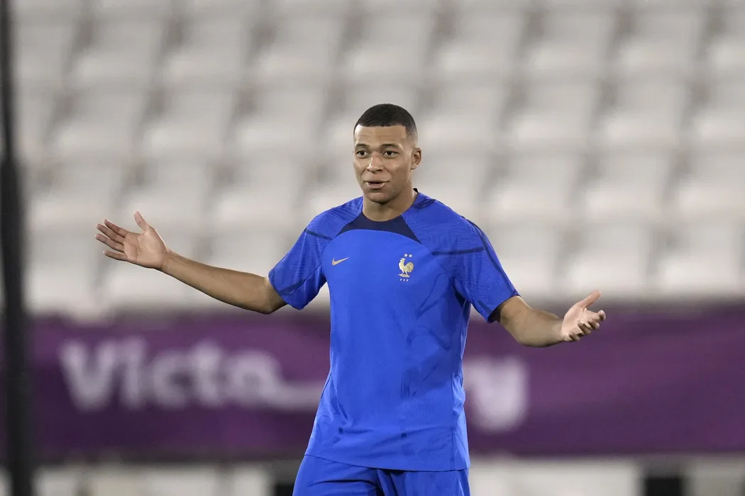 France's Kylian Mbappe gestures during a training session in Doha, Qatar, Tuesday, Dec. 13, 2022 on the eve of their World Cup semifinal soccer match against Morocco. (AP Photo/Christophe Ena)