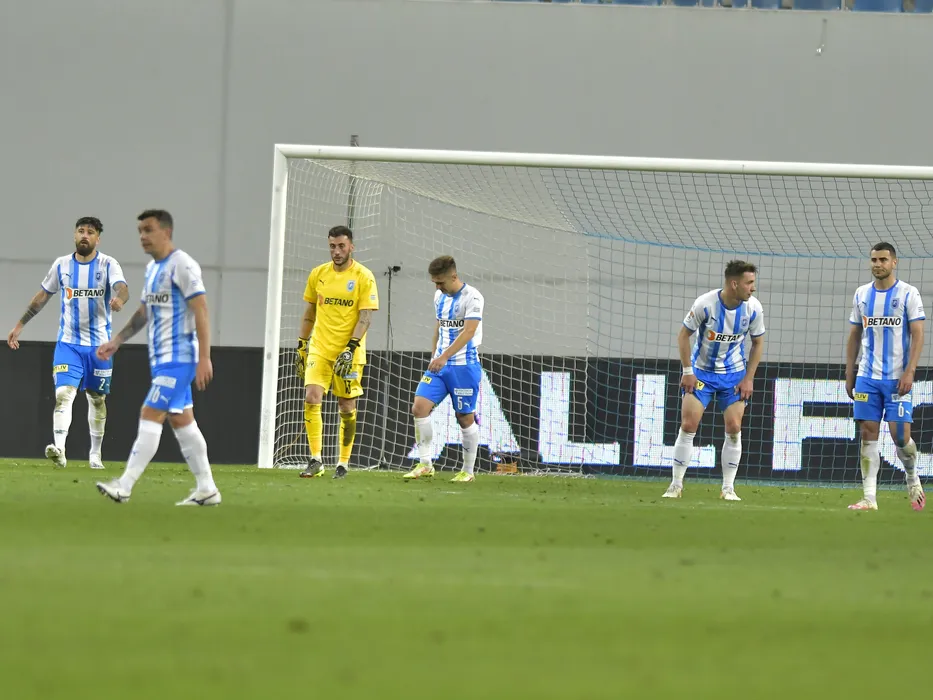 Fotbalistii craioveni Paul Papp, Mirko Pigliacelli, Bogdan Ilie Vatajelu, Alexandru Mateiu si Screciu Vladimir Ionut suparati dupa un gol primit in meciul de fotbal dintre Universitatea Craiova si Sepsi OSK Sfantu Gheorghe, contand pentru Cupa Romaniei, desfasurat pe Stadionul Ion Oblemenco din Craiova, joi 12 mai 2022. © FOTO:Razvan Pasarica/SPORT PICTURES