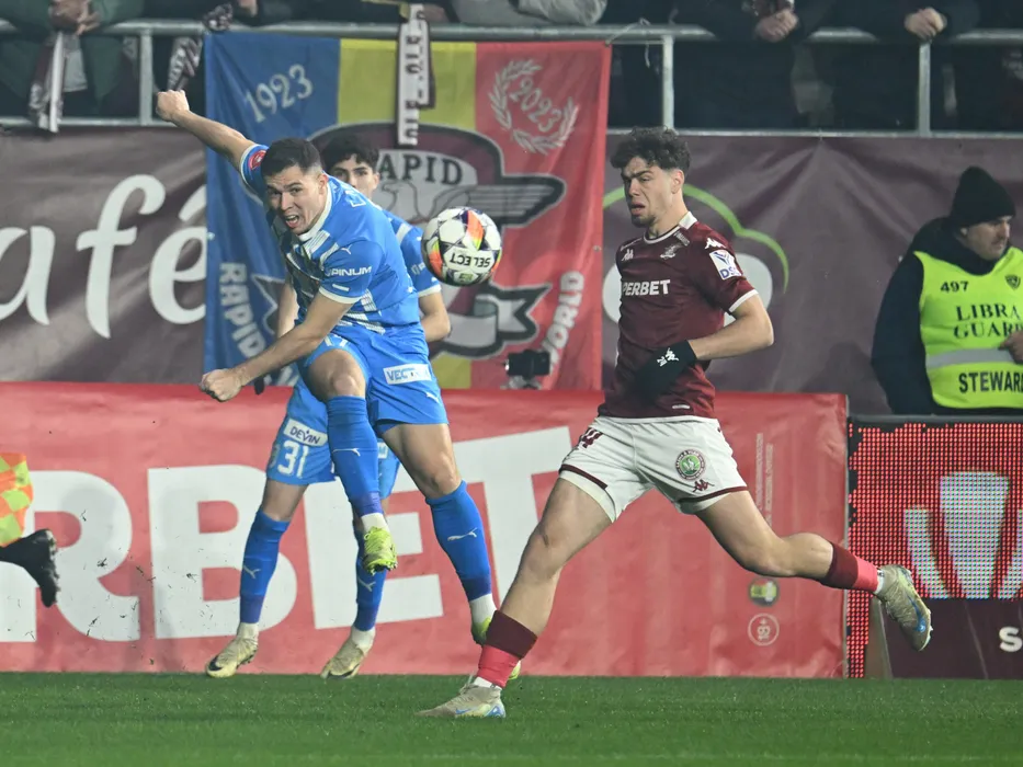 Carlos Andrei Mora Montoya si Sebastian Andrei Borza in meciul de fotbal dintre Rapid Bucuresti si Universitatea Craiova, din cadrul Superligii Superbet, desfasurat pe Superbet Arena-Giulesti din Bucuresti, sambata 25 ianuarie 2025. © FOTO:Razvan Pasarica/SPORT PICTURES