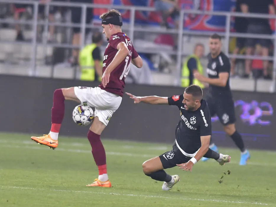 Mattias Kait si Razvan Constantin Oaida in meciul de fotbal dintre Rapid Bucuresti si FCSB, contand pentru Superliga Superbet, desfasurat pe Stadionul Rapid Giulesti din Bucuresti, duminica 24 iulie 2022. © FOTO:Razvan Pasarica/SPORT PICTURES