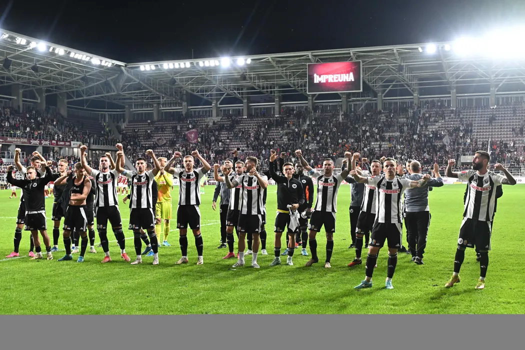 Fotbalistii clujeni Robert Mihai Silaghi, Gabriel Bogdan Simion, Dorin Marian Codrea, Lucian Iulian Cristea, Bogdan Alexandru Mitrea, Mihaita Alexandru Chipciu, Ovidiu Marian Popescu, Ovidiu Alexandru Bic, Dan Nicolae Nistor si Vadim Rata saluta galeria dupa meciul de fotbal dintre Rapid Bucuresti si Universitatea Cluj, din cadrul Superligii Superbet, desfasurat pe Superbet Arena-Giulesti din Bucuresti, luni 16 septembrie 2024. © FOTO:Razvan Pasarica/SPORT PICTURES