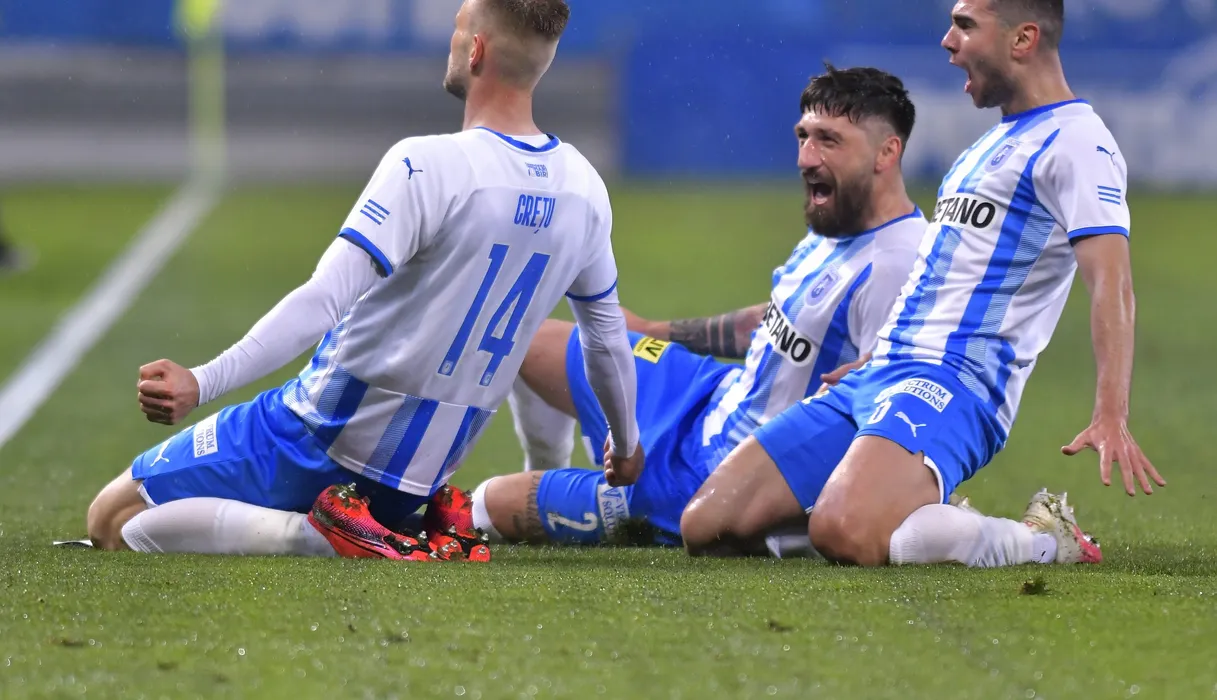 Alexandru Cretu se bucura dupa un gol marcat alaturi de Paul Papp si Screciu Vladimir Ionut in meciul de fotbal dintre Universitatea Craiova si CFR Cluj, contand pentru Play-off-ul Ligii 1 Casa Pariurilor, desfasurat pe Stadionul Ion Oblemenco din Craiova, duminica 10 aprilie 2022. © FOTO:Razvan Pasarica/SPORT PICTURES