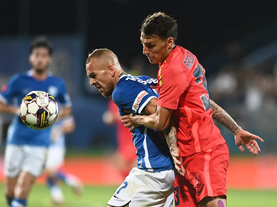 Denis Alibec si Risto Radunovic in meciul de fotbal dintre Farul Constanta si FCSB, contand pentru Superliga Superbet, desfasurat pe Stadionul central al Academiei Gheorghe Hagi din Ovidiu, miercuri 31 august 2022. © FOTO:Razvan Pasarica/SPORT PICTURES