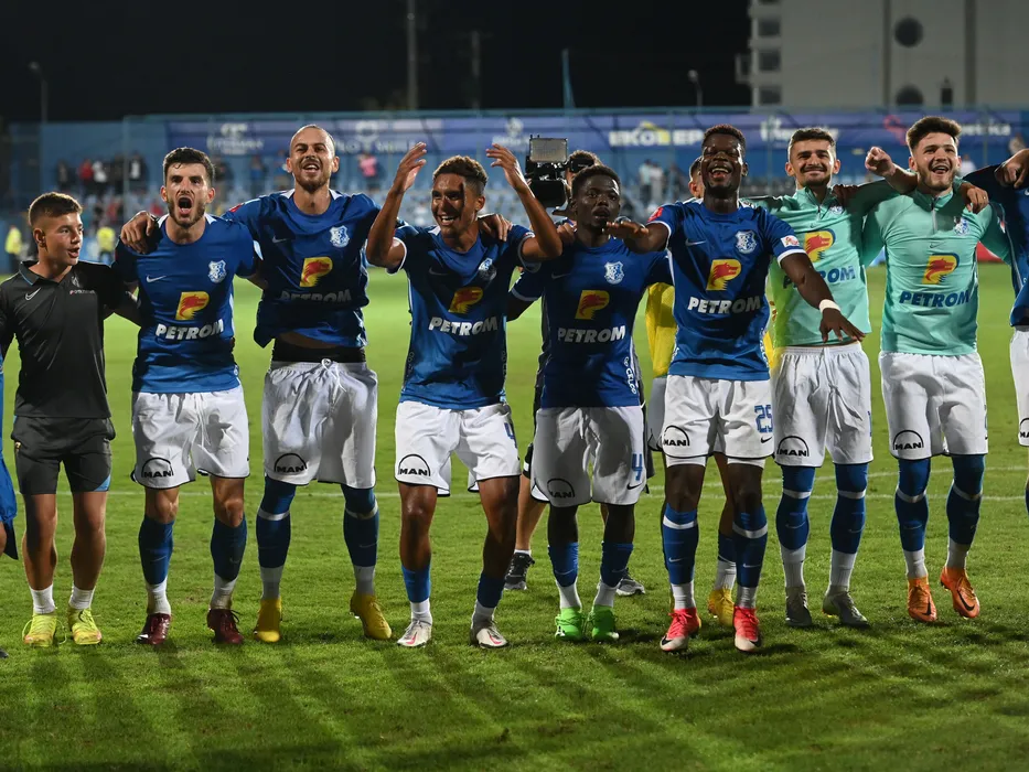 Bucurie a fotbalistilor constanteni Mihai Popescu, Denis Alibec, Jeremy Jimmy Theophile Corinus, Kevin Doukoure Grobry, Enagnon David Kiki, Vladut Calin Morar si Dan Sirbu dupa meciul de fotbal dintre Farul Constanta si FCSB, contand pentru Superliga Superbet, desfasurat pe Stadionul central al Academiei Gheorghe Hagi din Ovidiu, miercuri 31 august 2022. © FOTO:Razvan Pasarica/SPORT PICTURES