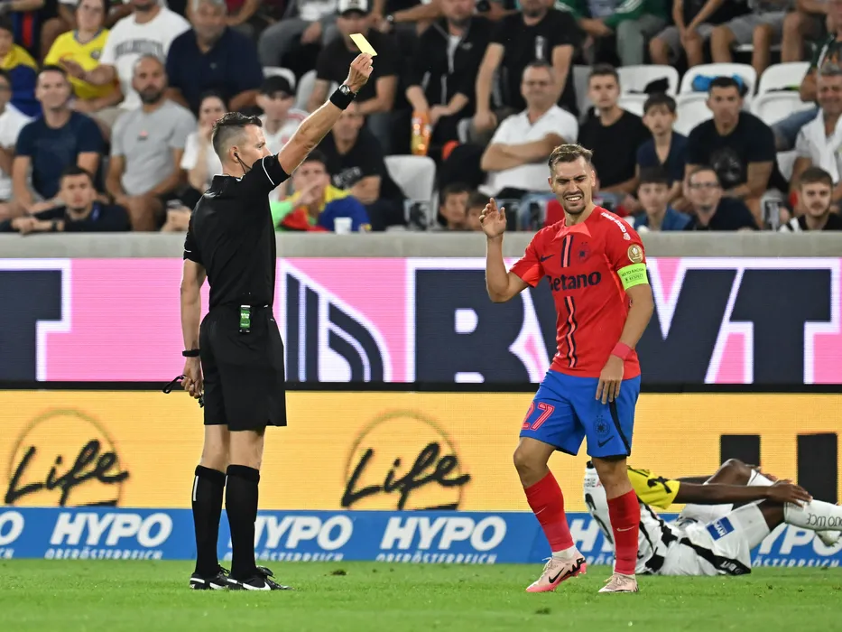 Arbitrul central Allard Lindhout acorda un cartonaș galbenlui Darius Dumitru Olaru in meciul dintre Lask Linz si FCSB, contand pentru Play off-ul Europa League, desfasurat pe Oberösterreich Arena din Linz, joi 22 august 2024. © FOTO:Razvan Pasarica/SPORT PICTURES