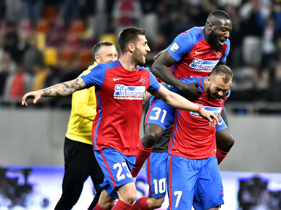 Ovidiu Popescu,Eddy Harlem Gnohere si Denis Alibec se bucura la finalul meciului de fotbal dintre FCSB si Dinamo Bucuresti, disputat pe National Arena din Bucuresti, in cadrul play off-ului Ligii 1 Orange, duminica 2 aprilie 2017.Razvan Pasarica/ SPORT PICTURES