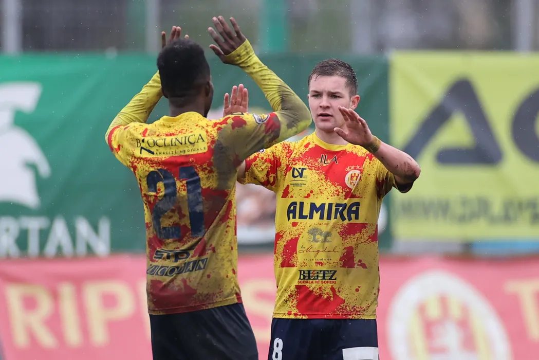 Yuri-Stephane Coulibaly si Alexandru Piftor in meciul de fotbal dintre Ripensia Timisoara si Universitatea Cluj, contand pentru Liga a-2-a Casa Pariurilor, desfasurat fara spectatori pe Stadionul Electrica din Timisoara, duminica 18 aprilie 2021. © FOTO:Sebastian Tataru/SPORT PICTURES