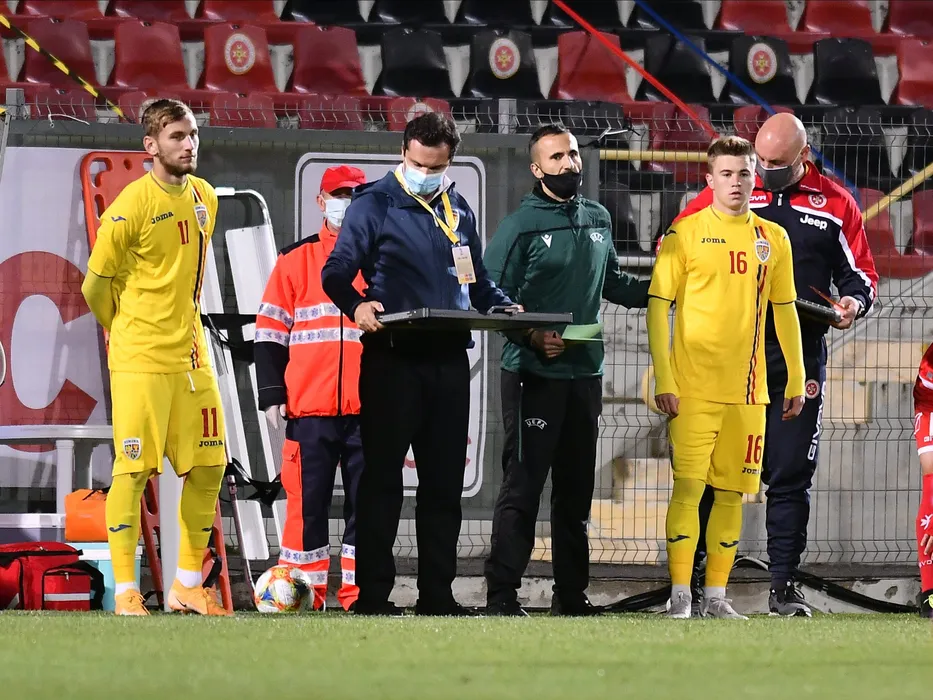 Vlad Munteanu si arbitrul de rezerva Alban Shala anunta intrarea in teren a fotbalistilor romani Denis Dragus si Claudiu Petrila in meciul de fotbal dintre Romania U21 si Malta U21, din cadrul Preliminariilor Campionatului European din 2021, desfasurat fara spectatori pe Stadionul Marin Anastasovici din Giurgiu, marti 13 octombrie 2020. © FOTO:Razvan Pasarica/SPORT PICTURES