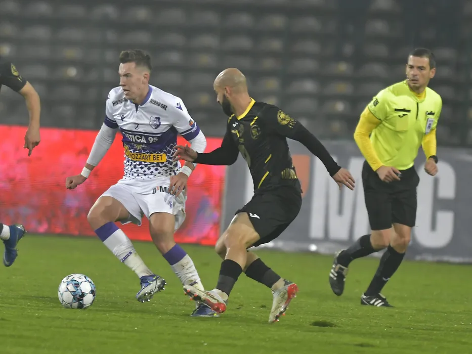 Mihai Alexandru Isfan si Gabriel De Moura Rodrigues in meciul de fotbal dintre FC Arges si Gaz Metan Medias, contand pentru Liga 1 Casa Pariurilor, desfasurat pe Stadionul Nicolae Dobrin din Pitesti, luni 6 decembrie 2021. © FOTO:Razvan Pasarica/SPORT PICTURES