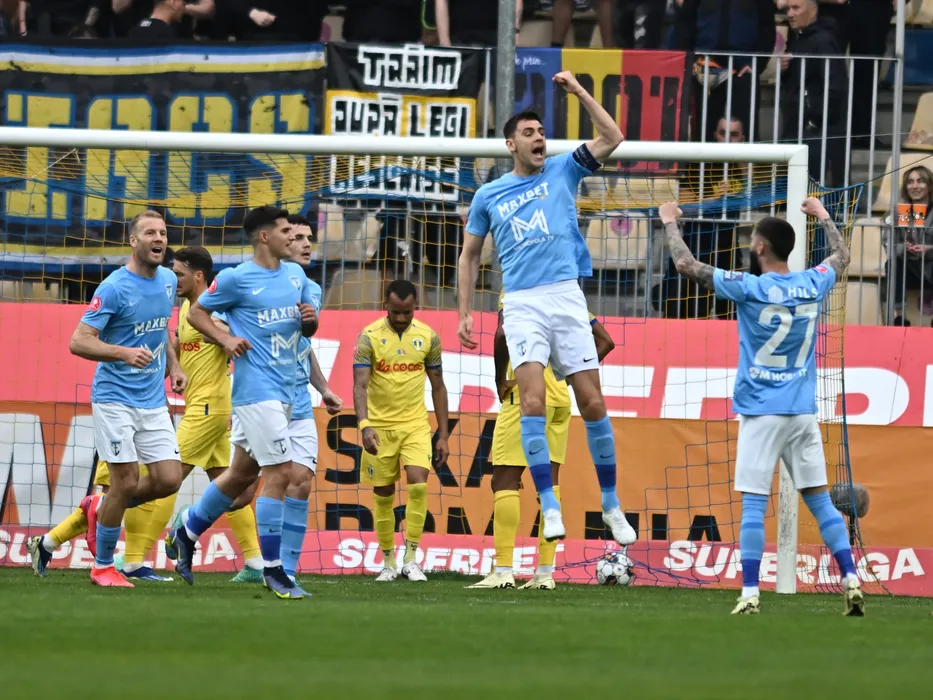 Bucurie a fotbalistilor voluntareni Adam Nemec, Doru Cristian Andrei, Ioan Andrei Vasile Dumiter si Igor Armaș dupa un gol marcat in meciul de fotbal dintre Petrolul Ploiesti si FC Voluntari, din cadrul Play out-ului Superligii Superbet, desfasurat pe Stadionul Ilie Oana din Ploiesti, sambata 6 aprilie 2024. © FOTO:Razvan Pasarica/SPORT PICTURES