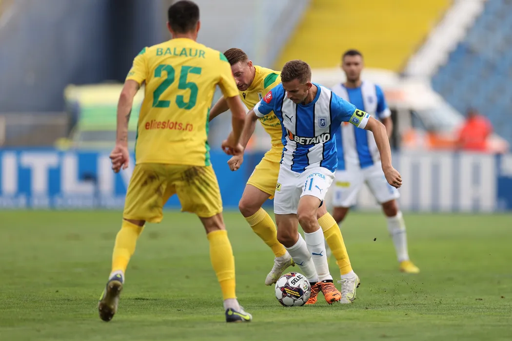 Liviu Ion Antal si Nicusor Silviu Bancu in meciul de fotbal dintre Universitatea Craiova si CS Mioveni, contand pentru Superliga Superbet, desfasurat pe Stadionul Municipal din Drobeta Turnu Severin, duminica 14 august 2022. © FOTO:Sebastian Tataru/SPORT PICTURES