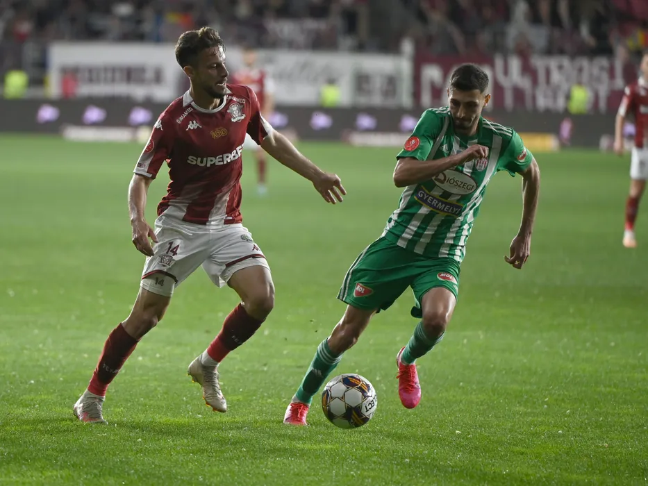 Jakub Hromada si Nicolae Ionut Paun in meciul de fotbal dintre Rapid Bucuresti si Sepsi OSK Sfantu Gheorghe, din cadrul Play off-ului Superligii Superbet, desfasurat pe Superbet Arena-Giulesti din Bucuresti, luni 15 aprilie 2024. © FOTO:Razvan Pasarica/SPORT PICTURES