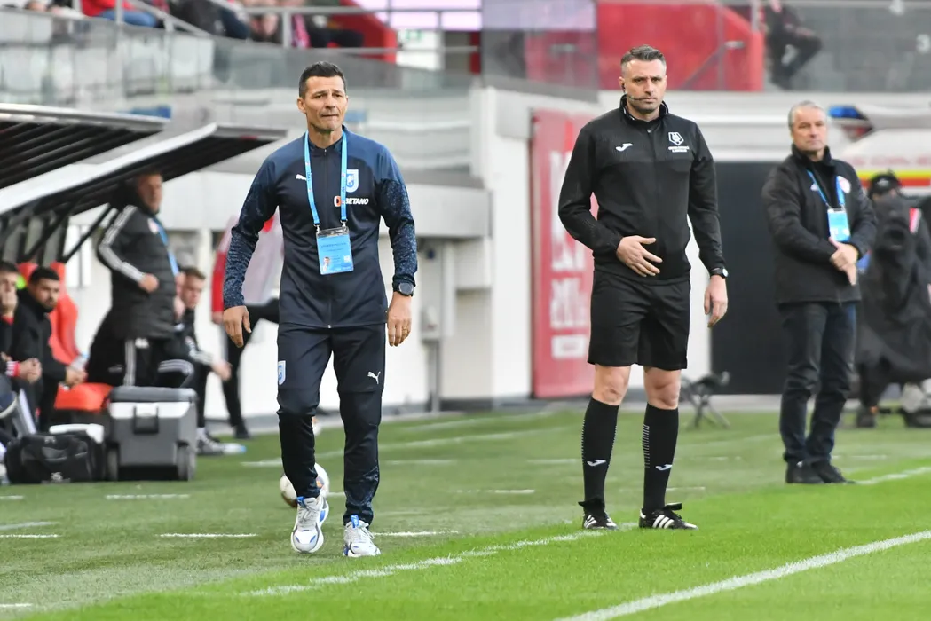 Costel Gâlcă și Arbitrul de rezerva Andrei Moroiță în meciul de fotbal dintre Sepsi OSK Sfantu Gheorghe și Universitatea Craiova, contând pentru SuperLiga Superbet Play-Off, desfășurat pe Stadionul SEPSI Arena OSK din Sfântu Gheorghe, duminică 21 aprilie 2024. © FOTO: Bogdan BALAS/SPORT PICTURES