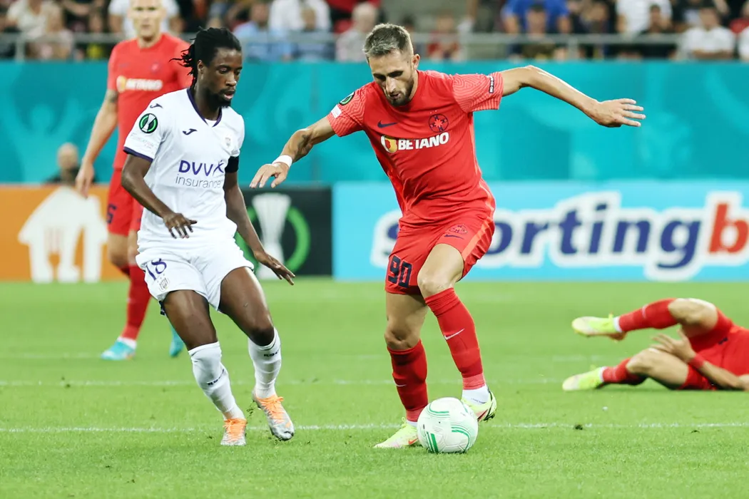 Bogdan Rusu (D), de la FCSB, lupta pentru balon cu Majed Ashimeru (S), de la Anderlecht, in meciul de fotbal din a doua etapa a grupei B din UEFA Conference League, disputat pe Arena Nationala din Bucuresti, joi, 15 august 2022. GEORGE FILIP / MEDIAFAX FOTO