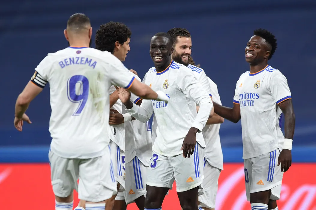 MADRID, SPAIN - MAY 12: Ferland Mendy of Real Madrid celebrates with team mates after scoring their side's first goal during the La Liga Santander match between Real Madrid CF and Levante UD at Estadio Santiago Bernabeu on May 12, 2022 in Madrid, Spain. (Photo by Denis Doyle/Getty Images)