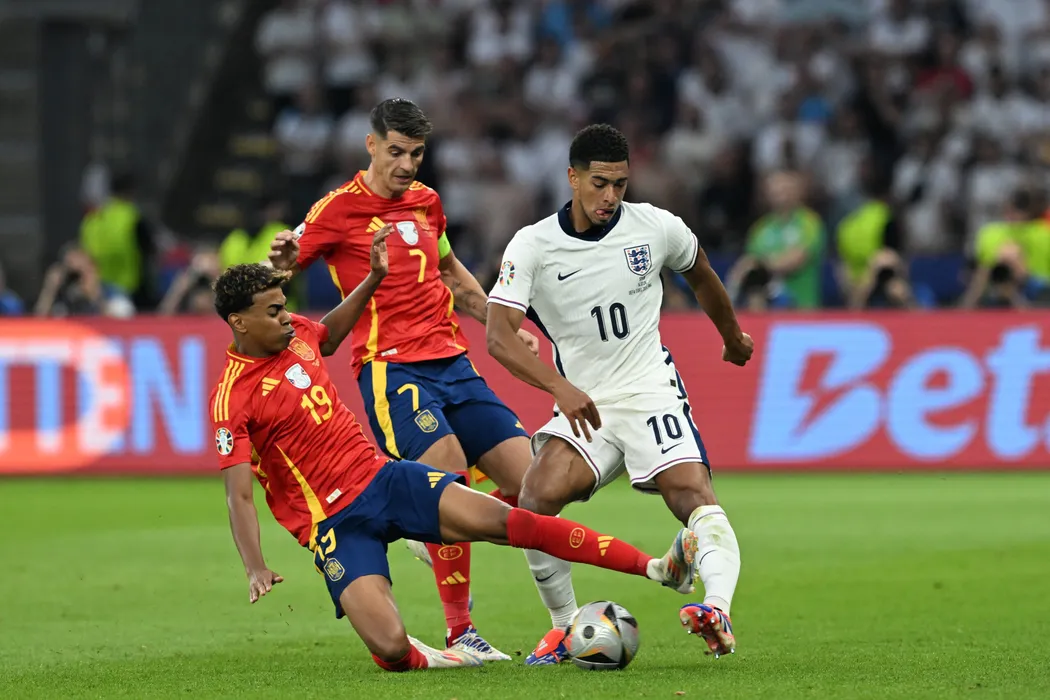 14 July 2024, Berlin: Spain's Lamine Yamal (L) and Alvaro Morata (C) battle for the ball around England's Jude Bellingham battle for the ball during the UEFA Euro 2024 final soccer match between Spain and England at the Olympic Stadium. Photo: Federico Gambarini/dpa