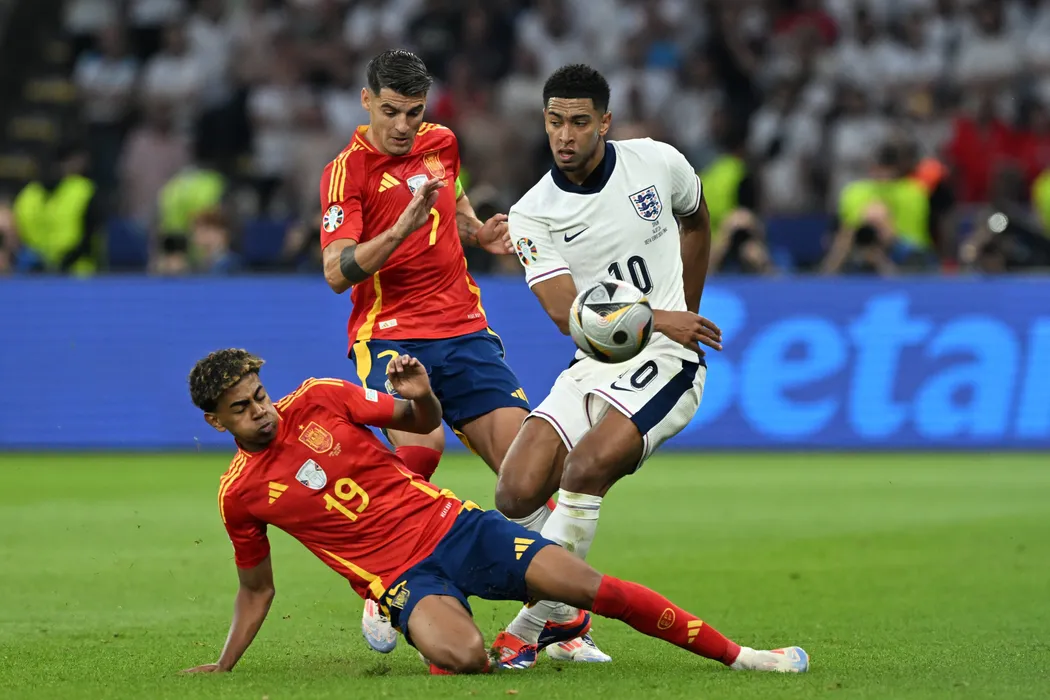 14 July 2024, Berlin: Spain's Lamine Yamal (L) and Spain's Alvaro Morata battle for the ball around England's Jude Bellingham during the UEFA Euro 2024 final soccer match between Spain and England at the Olympic Stadium. Photo: Federico Gambarini/dpa