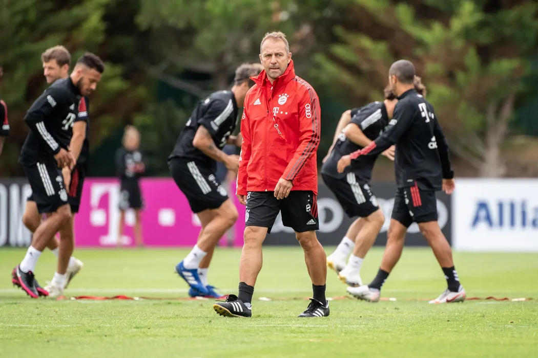 12 August 2020, Portugal, Lagos: Bayern Munich coach Hansi Flick (C) leads a training session ahead of Friday's UEFA Champions League quarter-final soccer match against Barcelona. Photo: Matthias Balk/dpa
