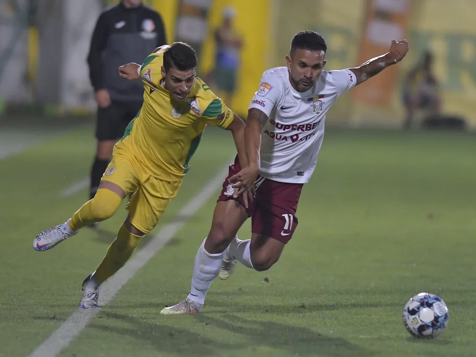 Daniel Marian Toma si Morais Junior Iraneuton Sousa in meciul de fotbal dintre CS Mioveni si Rapid Bucuresti, contand pentru Liga 1 Casa Pariurilor, desfasurat pe Stadionul Orasenesc din Mioveni, sambata 23 iulie 2021. © FOTO:Razvan Pasarica/SPORT PICTURES