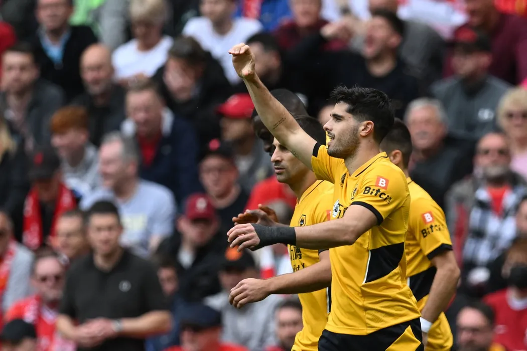 Wolverhampton Wanderers' Portuguese midfielder Pedro Neto celebrates after scoring his team first goal during the English Premier League football match between Liverpool and Wolverhampton Wanderers at Anfield in Liverpool, north west England on May 22, 2022.,Image: 693525871, License: Rights-managed, Restrictions: RESTRICTED TO EDITORIAL USE. No use with unauthorized audio, video, data, fixture lists, club/league logos or 'live' services. Online in-match use limited to 120 images. An additional 40 images may be used in extra time. No video emulation. Social media in-match use limited to 120 images. An additional 40 images may be used in extra time. No use in betting publications, games or single club/league/player publications., Model Release: no, Credit line: Profimedia