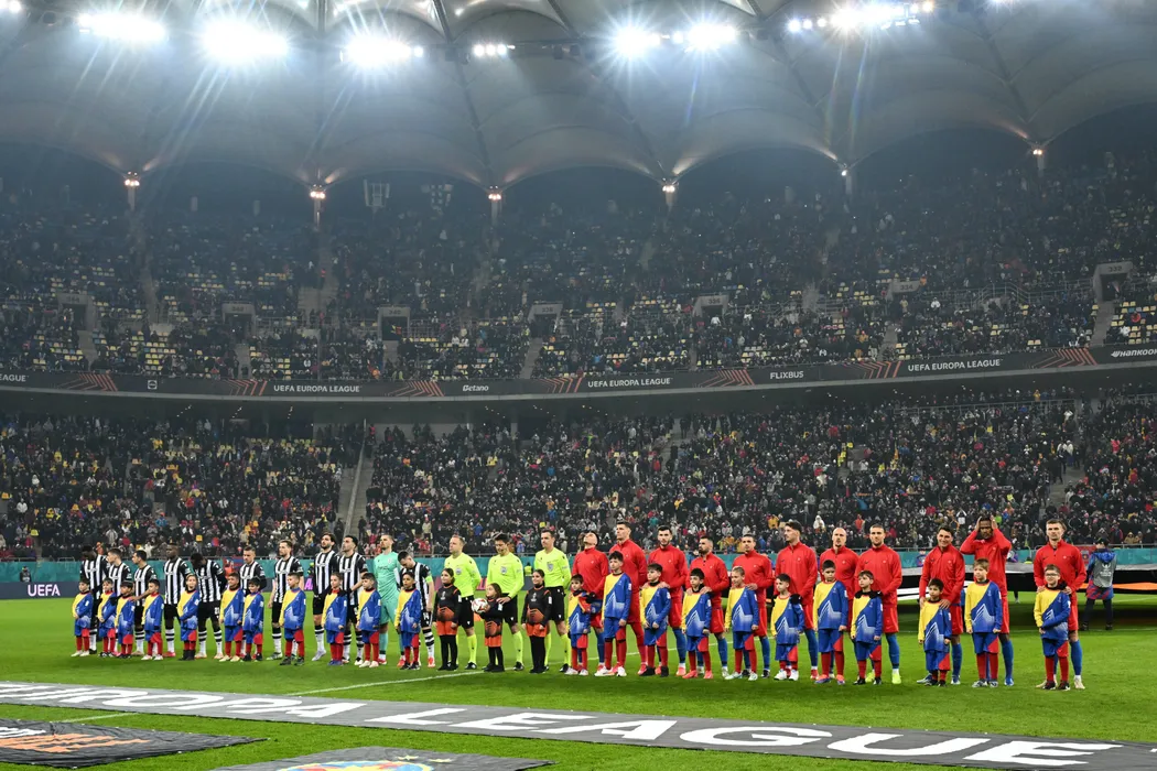 Fotbalistii celor doua echipe alaturi de brigada de arbitrii la startul meciului de fotbal dintre FCSB si PAOK Salonic, din cadrul UEFA Europa League, desfasurat pe Arena Nationala din Bucuresti, joi 20 februarie 2025. © FOTO:Razvan Pasarica/SPORT PICTURES