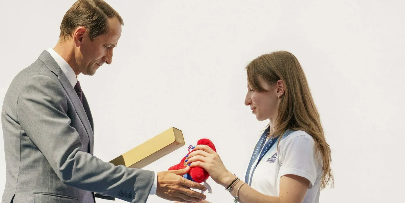 Mihai Covaliu, President of the Romanian Olympic and Sports Committee offers the Olympic games mascot to Romanian gymnast Ana Barbosu after she received the bronze medal for her women's artistic gymnastics individual floor performance at the Paris 2024 Olympics, during a ceremony, in Bucharest, Romania, Friday, Aug. 16, 2024. American gymnast Jordan Chiles called an arbitration panel's decision that dropped her out of the bronze medal position in the floor exercise at the Paris Olympics "unjust" and a "significant blow" in a message posted on social media Thursday.,Image: 899189667, License: Rights-managed, Restrictions: This content is intended for editorial use only. For other uses, additional clearances may be required., Model Release: no, Pictured: Jordan Chiles