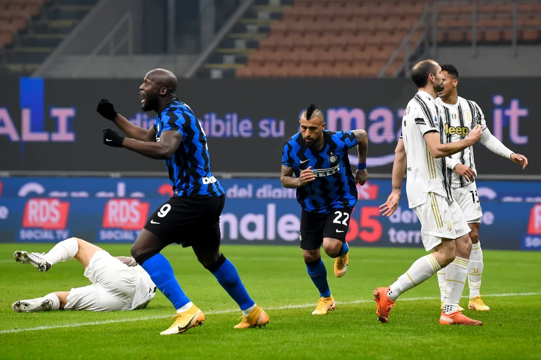 MILAN, ITALY - January 17, 2021: Arturo Vidal of FC Internazionale celebrates after scoring a goal during the Serie A football match between FC Internazionale and Juventus FC.,Image: 584233964, License: Rights-managed, Restrictions: *** World Rights ***, Model Release: no