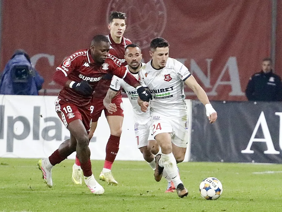 Antoni Valeri Ivanov, Jair Tavares Silva, Abdul Kader Keita si Mihai Alexandru Dobre in meciul de fotbal dintre AFC Hermannstadt Sibiu si FC Rapid Bucuresti, contand pentru Superliga Superbet, desfasurat pe Stadionul Municipal din Sibiu, marti 3 februarie 2026. © FOTO:Valentin Macrea/SPORT PICTURES