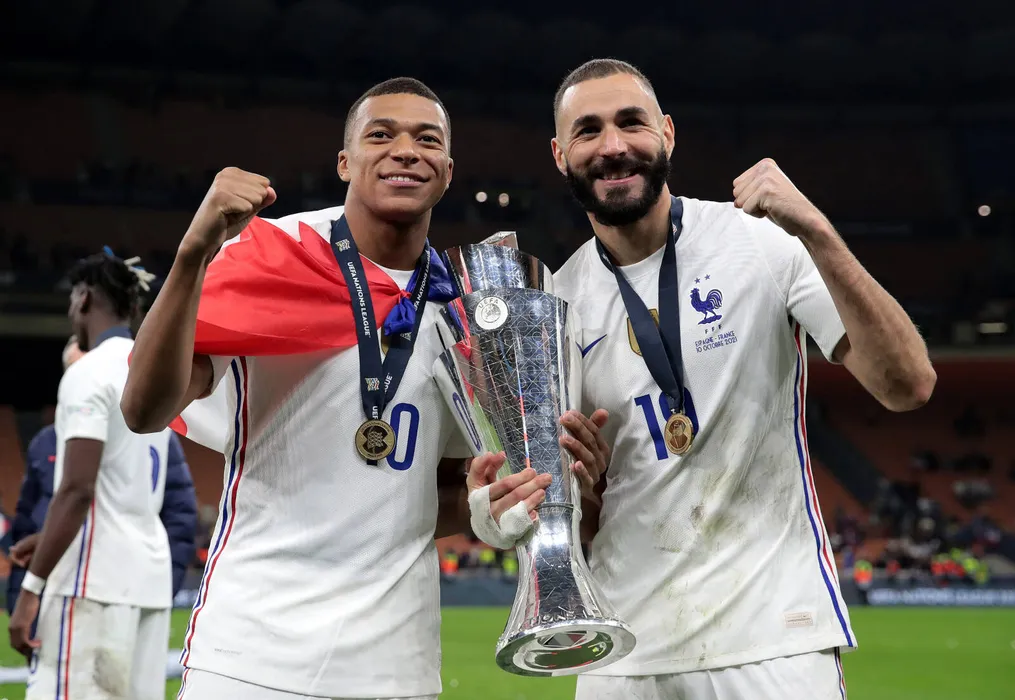 211011 -- MILAN, Oct. 11, 2021 -- France s Karim Benzema R and Kylian Mbappe pose with the trophy after the UEFA Nations League final match between France and Spain in Milan, Italy, Oct. 10, 2021. Photo by Emilio Andreoli/UEFA/Pool/handout via Xinhua SPITALY-MILAN-FOOTBALL-UEFA NATIONS LEAGUE-FINAL-FRANCE VS SPAIN JinxMamengnitonglian PUBLICATIONxNOTxINxCHN