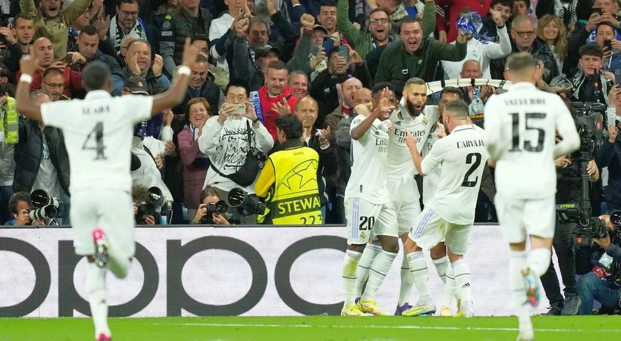 Real Madrid's Karim Benzema, right, celebrates with teammates after scoring the opening goal during the Champions League quarter final first leg soccer match between Real Madrid and Chelsea at Santiago Bernabeu stadium in Madrid, Wednesday, April 12, 2023.,Image: 768944342, License: Rights-managed, Restrictions: This content is intended for editorial use only. For other uses, additional clearances may be required., Model Release: no, Pictured: Karim Benzema