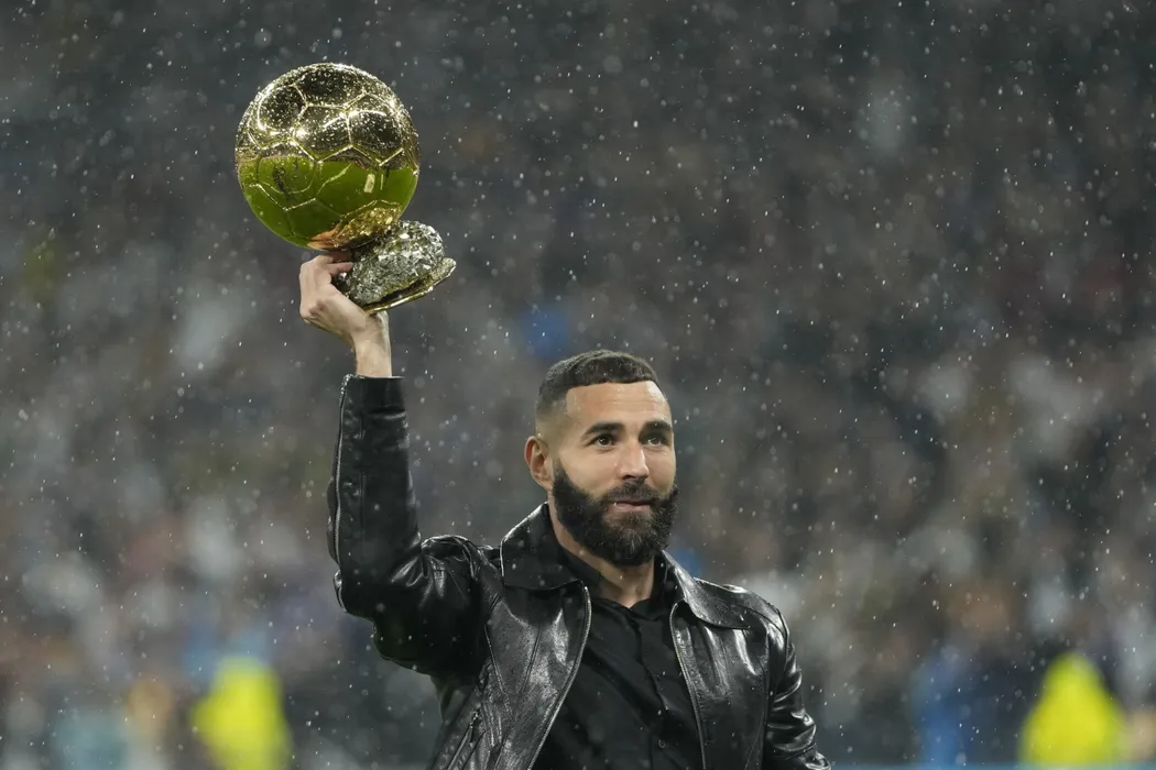 Real Madrid's Karim Benzema holds the 2022 Ballon d'Or trophy prior to the Spanish La Liga soccer match between Real Madrid and Sevilla at the Santiago Bernabeu stadium in Madrid, Saturday, Oct. 22, 2022. (AP Photo/Manu Fernandez)