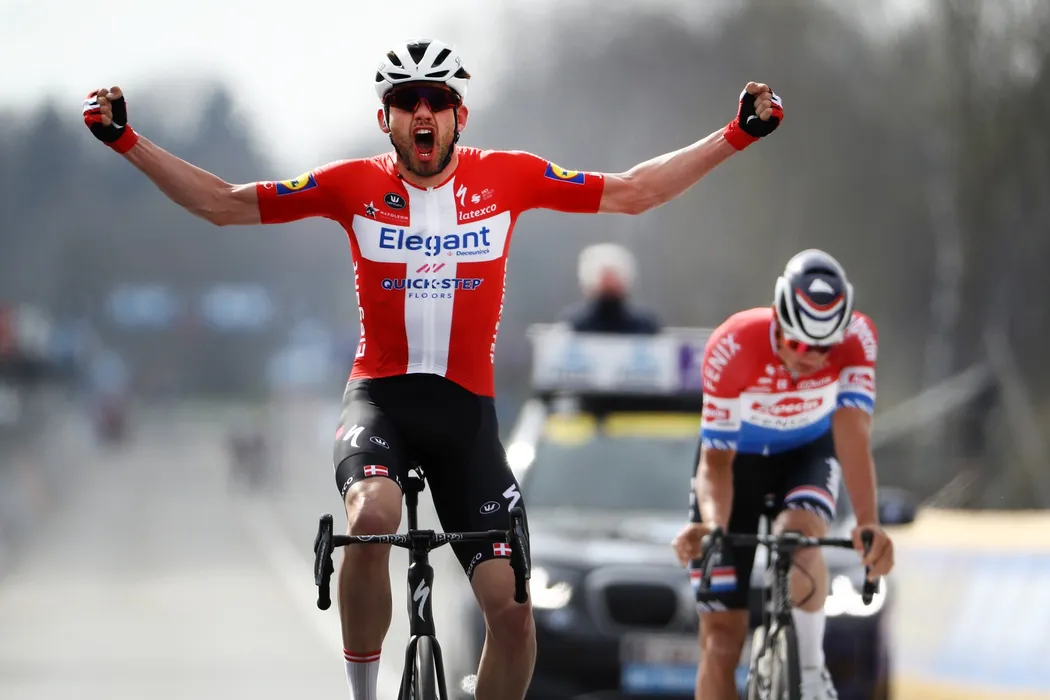 Danish Kasper Asgreen of Deceuninck - Quick-Step celebrates as he crosses the finish line to win the 105th edition of the 'Ronde van Vlaanderen - Tour des Flandres - Tour of Flanders' one day cycling race, 254km from Antwerp to Oudenaarde, Sunday 04 April 2021.
