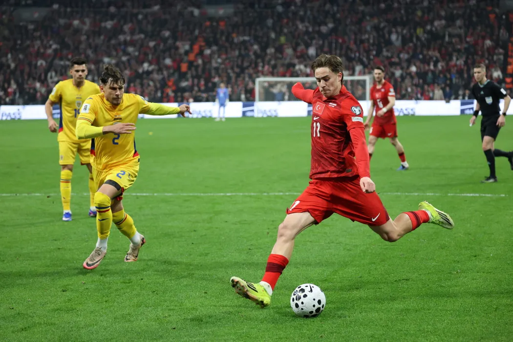 Meciul de fotbal dintre Turcia si Romania, din barajul pentru Cupa Mondiala 2026, desfasurat pe Besiktas Arena, Istanbul, joi, 25 martie 2026. In imagine: Andrei Ratiu (S) si Kenan Yildiz (D). LUCIAN DANCIU / MEDIAFAX FOTO