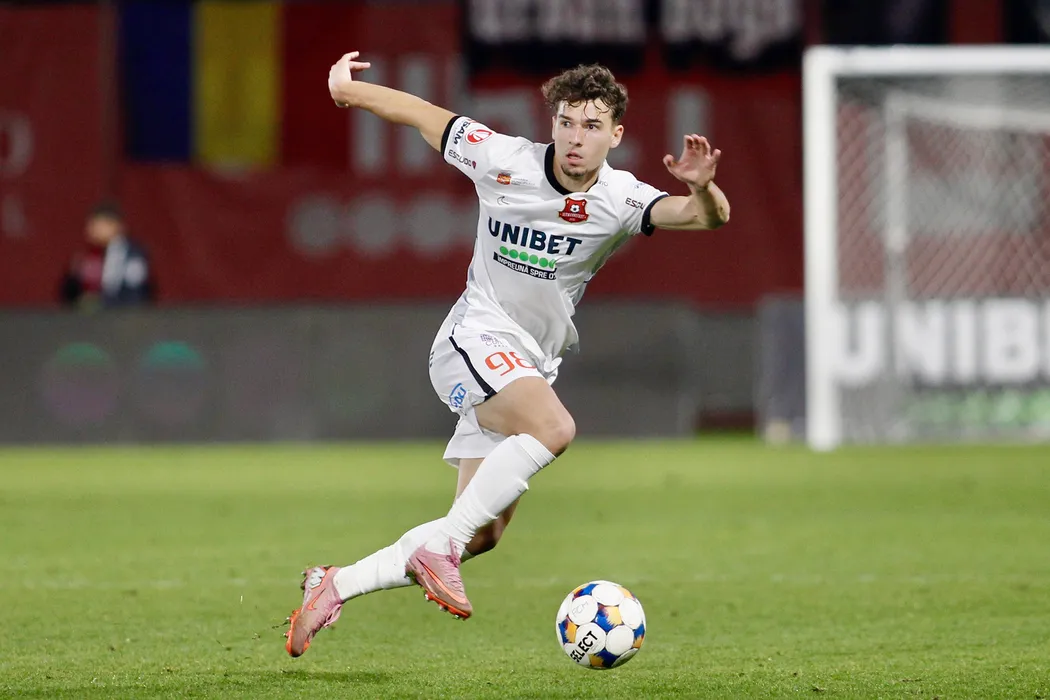 Meciul de fotbal dintre AFC Hermannstadt (echipament alb) si Otelul Galati (echipament rosu), din etapa a XV-a a Superligii, disputat pe stadionul Municipal din Sibiu, duminica, 2 noiembrie 2025. In imagine: Kevin Ciubotaru. OVIDIU MATIU / MEDIAFAX FOTO