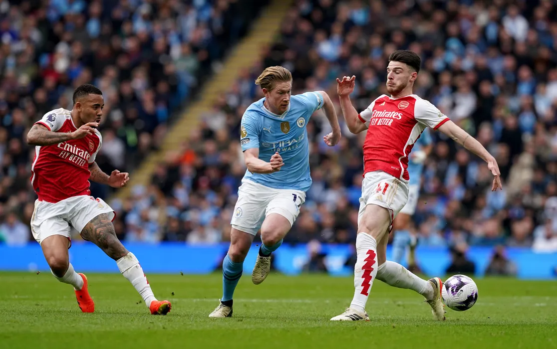31 March 2024, United Kingdom, Manchester: Manchester City's Kevin De Bruyne breaks past Arsenal's Declan Rice (R) during the English Premier League soccer match between Manchester City and Arsenal at the Etihad Stadium. Photo: Martin Rickett/PA Wire/dpa