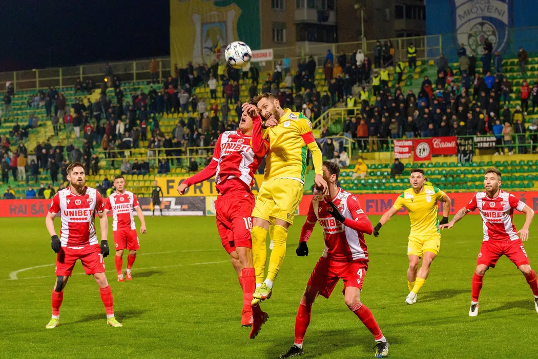 Gheorghe Bogdan Rusu. Pinto Andre Almeida si Nikolaos Kainourgios in meciul de fotbal dintre CS Mioveni si Dinamo Bucuresti, contand pentru Liga 1 Casa Pariurilor, desfasurat pe Stadionul Orasenesc din Mioveni, joi 16 decembrie 2021. © FOTO:Mihai Nitoiu/SPORT PICTURES
