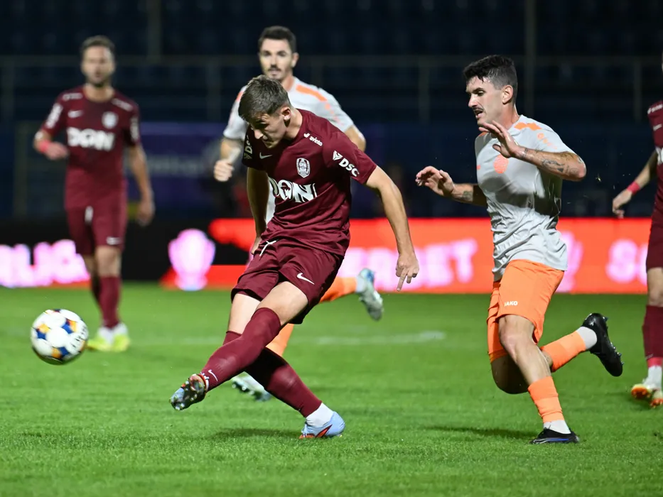 Lindon Emerllahu si Tous Damia Sabater in meciul de fotbal dintre Metaloglobus Bucuresti si CFR Cluj, contand pentru Superliga Superbet, desfasurat pe Clinceni Arena din Clinceni, sambata 13 septembrie 2025. © FOTO:Razvan Pasarica/SPORT PICTURES