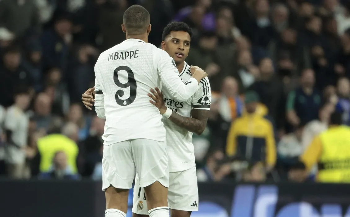 Rodrygo of Real Madrid celebrates his goal with Kylian Mbappe during the UEFA Champions League, Round of 16, 1st leg football match between Real Madrid and Atletico de Madrid on March 4, 2025 at Santiago Bernabeu stadium in Madrid, Spain - Photo Jean Catuffe / DPPI,Image: 972155610, License: Rights-managed, Restrictions: Hungary Out, Model Release: no