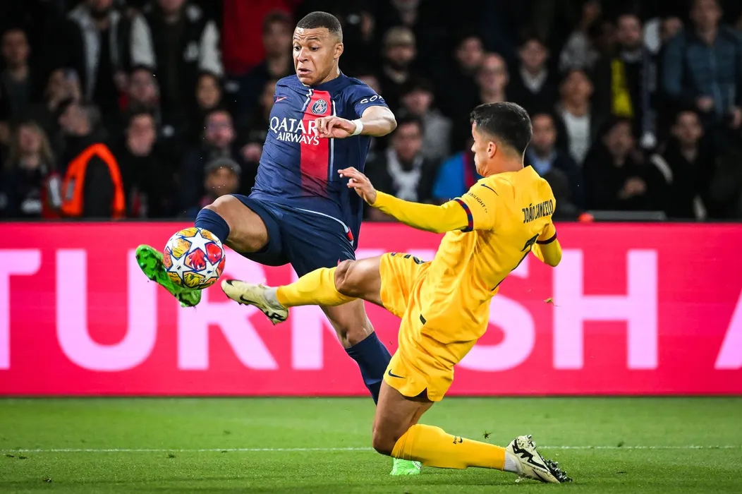 Kylian MBAPPE of PSG and Joao CANCELO of Barcelona during the UEFA Champions League, Quarter-finals, 1st leg football match between Paris Saint-Germain and FC Barcelona on April 10, 2024 at Parc des Princes stadium in Paris, France - Photo Matthieu Mirville / DPPI