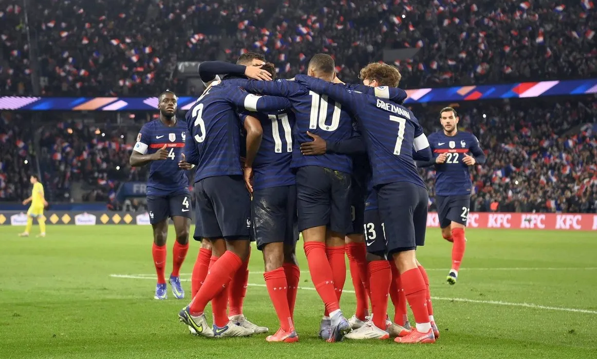 France's forward Kylian Mbappe (C) is congratulated by teammates after scoring a goal during the FIFA World Cup 2022 qualification football match between France and Kazakhstan at the Parc des Princes stadium in Paris, on November 13, 2021.,Image: 643022581, License: Rights-managed, Restrictions: , Model Release: no, Credit line: Profimedia
