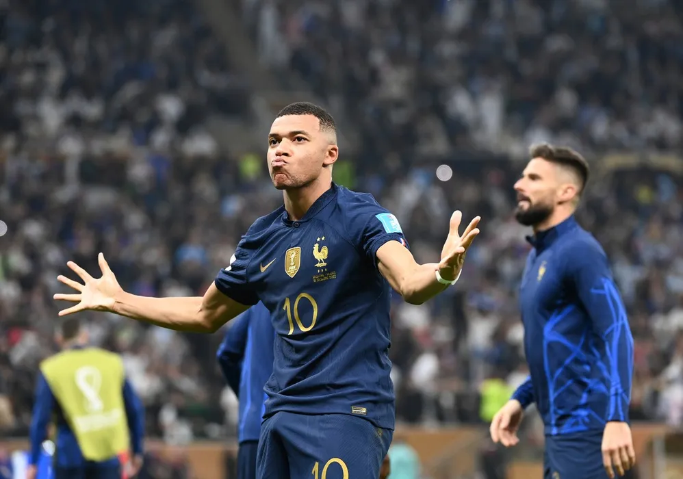 France's Kylian MBAPPE reacts after scoring his second goal during the FIFA World Cup Final match at Lusail Iconic Stadium in Lusail, Qatar on Dec. 18, 2022.,Image: 745390408, License: Rights-managed, Restrictions: This content is intended for editorial use only. For other uses, additional clearances may be required.