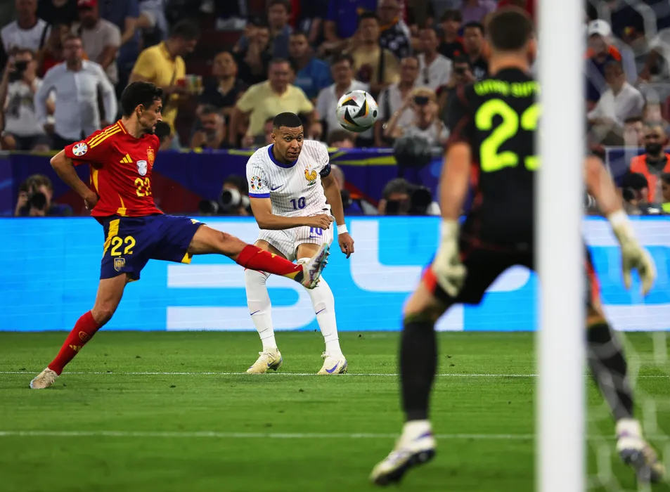 09 July 2024, Bavaria, Munich: France's Kylian Mbappe (C) shoots at Spain goalkeeper Unai Simon's goal alongside Spain's Jesus Navas (L) during the UEFA Euro 2024 Semi-final soccer match between Spain and France at Munich Football Arena. Photo: Christian Charisius/dpa