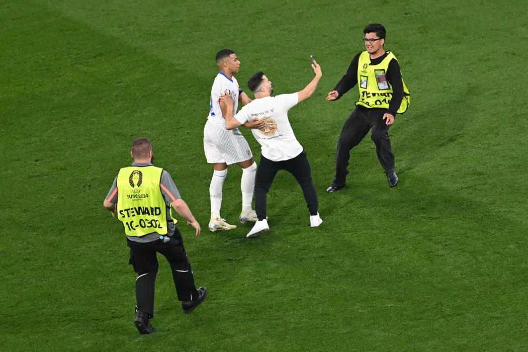 09 July 2024, Bavaria, Munich: A streaker stands next to France's Kylian Mbappe (2nd L) with a smartphone in his hand, the stewards run after him during the UEFA Euro 2024 Semi-final soccer match between Spain and France at Munich Football Arena. Photo: Sven Hoppe/dpa