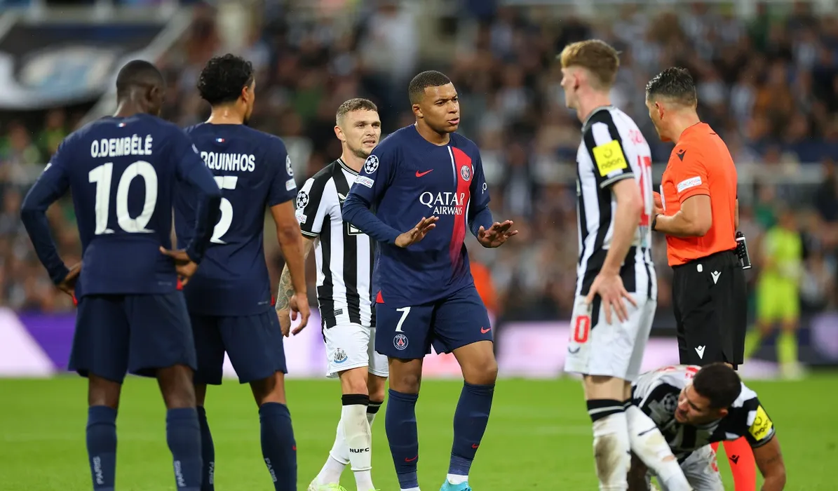 NEWCASTLE UPON TYNE, ENGLAND - OCTOBER 4: Referee Istvan Kovacs is spoken to by Kylian Mbappe of Paris Saint Germain during the UEFA Champions League match between Newcastle United FC and Paris Saint-Germain at St. James Park on October 4, 2023 in Newcastle upon Tyne, England. (Photo by Marc Atkins/Getty Images)